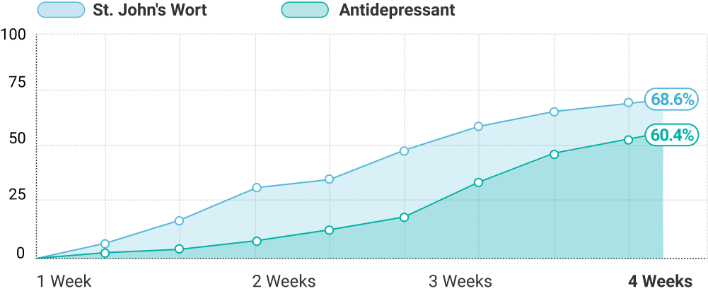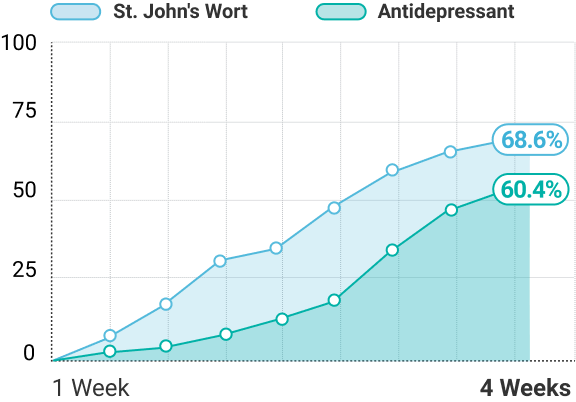St. John's Wort (as .3% extract) A controlled study in 241 people taking either St. John’s wort or an antidepressant found that 68.6% of people experienced a reduction in symptoms with St. John’s wort, compared to 60.4% of those on an antidepressant |
